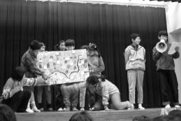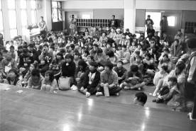 一生懸命発表する子供たちと熱心に聞く大勢の子供たち(聖母幼稚園内講堂にて)